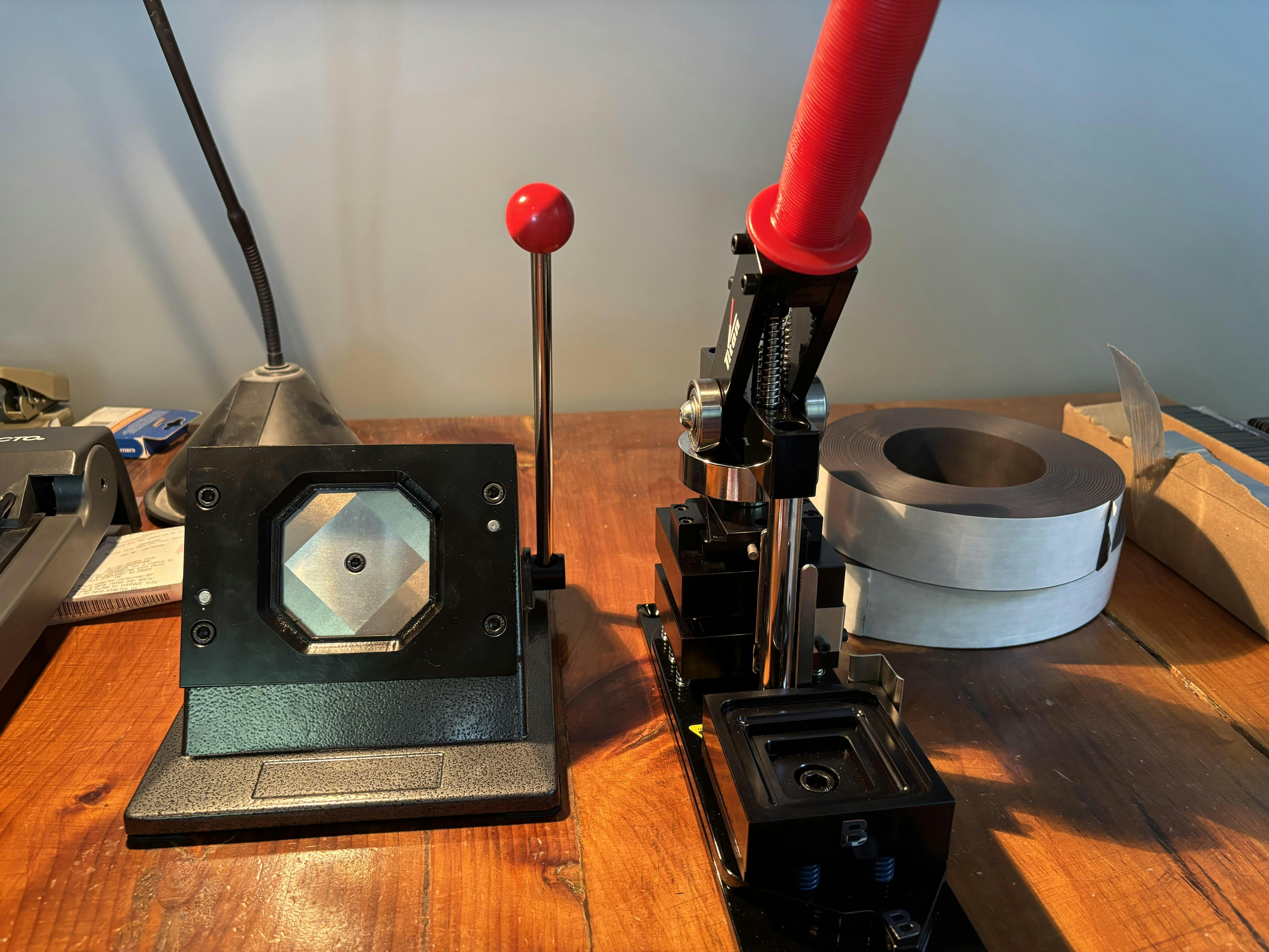 Professional square magnet and button making equipment. Make 2.5x2.5 magnets and pins using Titan Press Press and Paper Cutter.