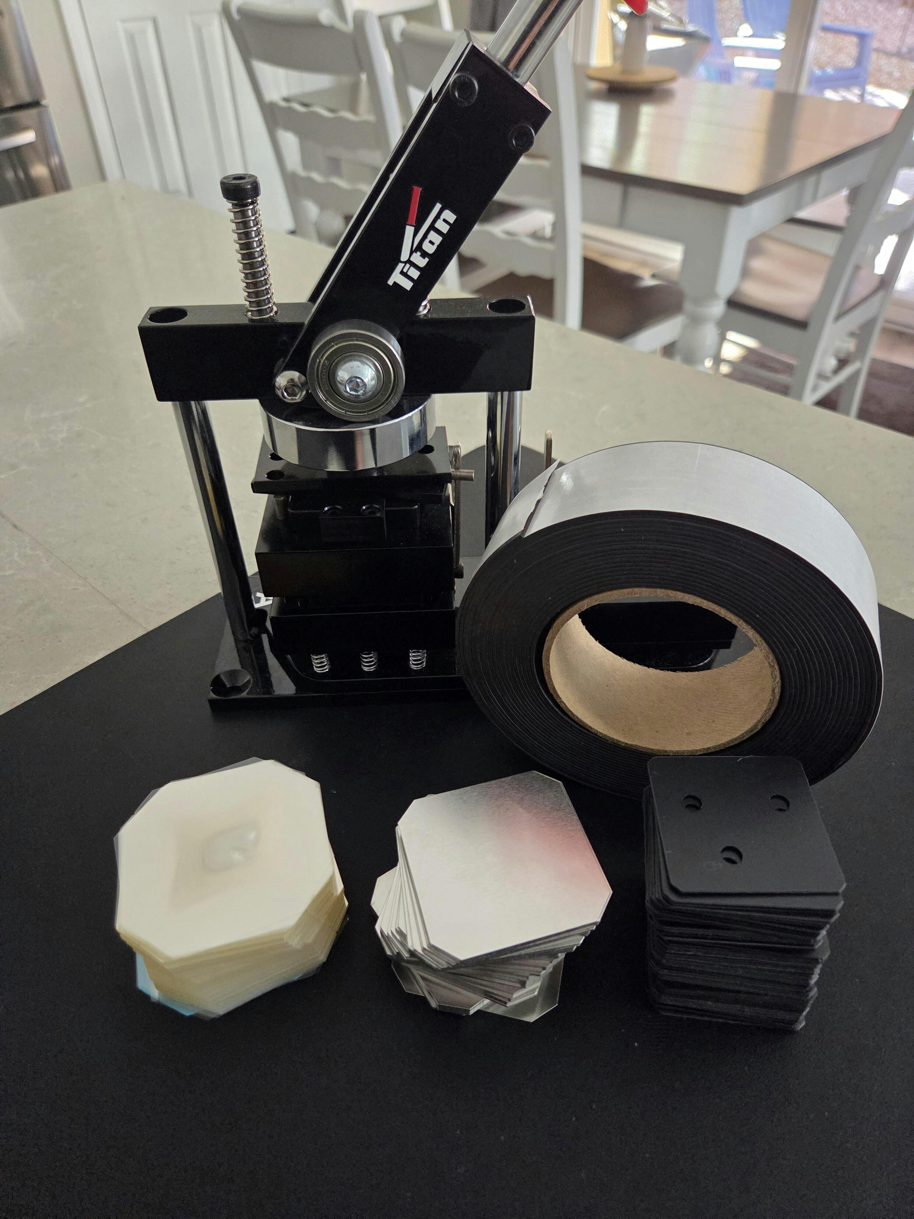 Magnet Pack includes: Mylar, Metal Shell, Unpinned Back, Adhesive Magnet (Square 1.75 x 1.75")